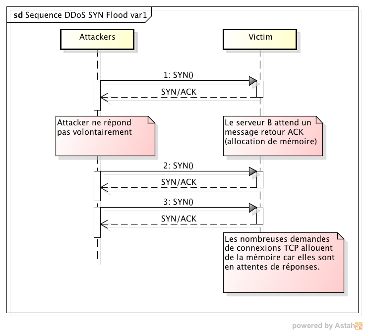 Une première variante de TCP SYN Flood consiste à demander des connexions TCP sur un système, sans terminer la 3ème étape. Les sessions TCP à moitiées ouvertes sont placées en attente (temps définis par le système). Cette attente consomme de la mémoire. Dans une certaine limite, les nombreuses sessions en attentes vont finir par rendre indisponible le système.